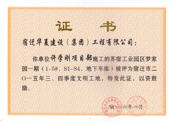 近日,蘇宿工業(yè)園區(qū)夢家園一期工程被評為宿遷市2015年度三、四季度文明工地。