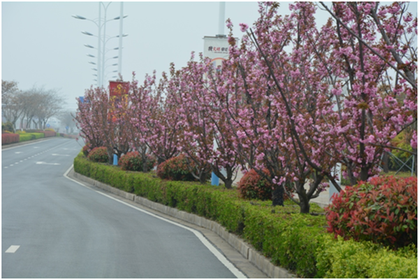 為把園區(qū)青海湖西路打造園區(qū)“櫻花大道”,按管委會部署,開發(fā)公司市政工程管理部對青海湖西路的行道樹進行整體更換,用櫻花代替原長勢不佳的廣玉蘭,經(jīng)過兩年的精心養(yǎng)護,整體長勢良好,每逢春季來臨櫻花盛開,為園區(qū)的景觀增添亮點,成為一道獨特靚麗的風(fēng)景線。