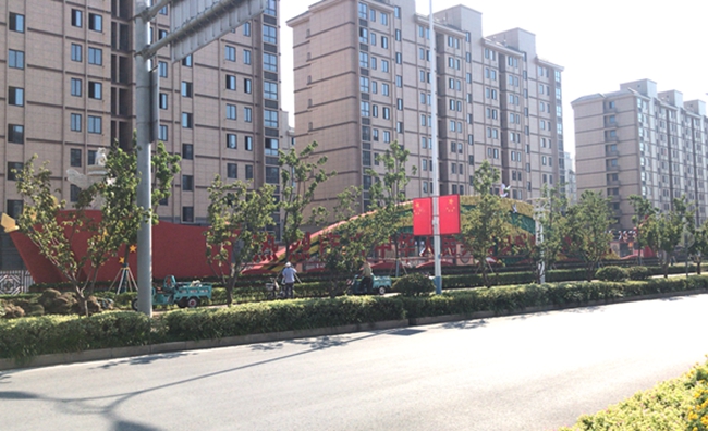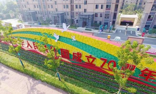 近期,走在道路上,園區(qū)居民會(huì)發(fā)現(xiàn)青海湖西路東入口南側(cè)設(shè)置一座建國70周年景觀雕塑,同時(shí)道路兩側(cè)路燈桿件懸掛國旗、中國結(jié)和70周年標(biāo)識(shí)的中國結(jié)等各式各樣的節(jié)日氛圍。