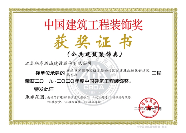 近期,傳來(lái)喜訊,由開(kāi)發(fā)公司代建的宿遷市蘇州外國(guó)語(yǔ)學(xué)校南校區(qū)擴(kuò)建及北校區(qū)新建裝飾工程獲得中國(guó)建筑裝飾行業(yè)最高獎(jiǎng)項(xiàng)“中國(guó)建筑工程裝飾獎(jiǎng)”。