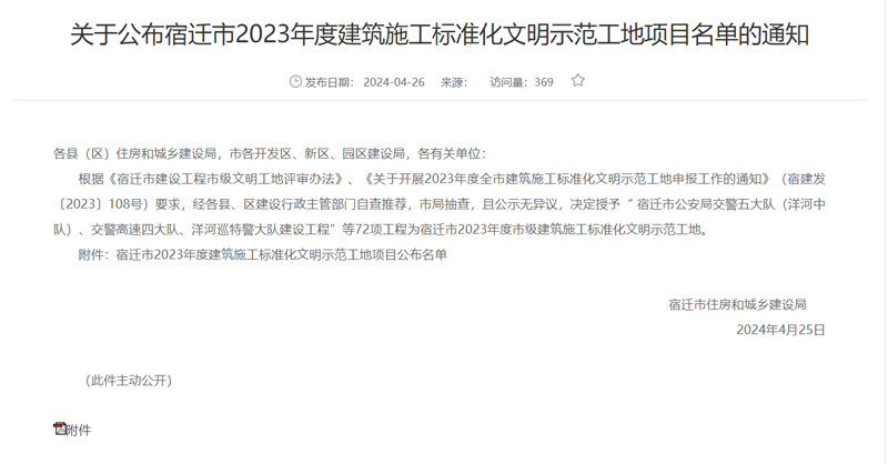 近日,宿遷市2023年度建筑施工標準化文明示范工地項目名單發(fā)布,蘇宿工業(yè)園區(qū)智慧信息產業(yè)園項目榮獲2023年度市級建筑施工標準化文明示范工地榮譽稱號。
