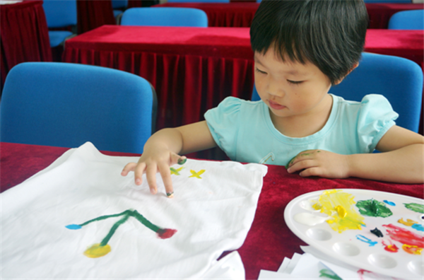來自園區(qū)各居民小區(qū)的十余名小朋友參加了開班課程,他們?cè)诩议L的陪同下,參加了第一期“親子DIY”課程,用自己的小手、畫筆在白凈的T恤上自由發(fā)揮,一幅幅“杰作”便在“神筆馬良”筆下誕生。