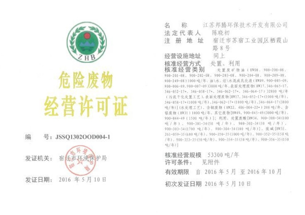 近日,園區(qū)江蘇邦騰環(huán)保技術(shù)開發(fā)有限公司獲頒由宿遷市環(huán)保局頒發(fā)的危險(xiǎn)廢物經(jīng)營許可證,主要從事利用、處置廢礦物油、廢酸、廢堿、表面處理廢物等,處理量為53300噸/年。