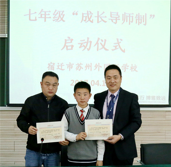 近日,宿遷市蘇州外國語學(xué)校七年級16位孩子和他們的家長監(jiān)護(hù)人還有他們新認(rèn)的“干爹”“干媽”齊聚學(xué)校階梯教室,舉行隆重的簽約儀式。這些“干爹”“干媽”是學(xué)校給首批孩子們配的成長導(dǎo)師,每位教師與一個孩子結(jié)對,全方位關(guān)心孩子的成長,陪伴孩子們一起度過快樂而充實的初中生活,力求“個個進(jìn)步,人人成星”?!俺砷L導(dǎo)師制”這種親情化、個性化、人本化的育人模式,是宿蘇外實施素質(zhì)教育,提升教育核心競爭力的需要;是宿蘇外服務(wù)家長,擴大教育品牌影響力的需要;是宿蘇外回報社會,落實“兩聚一高”,建設(shè)和諧社會的需要。